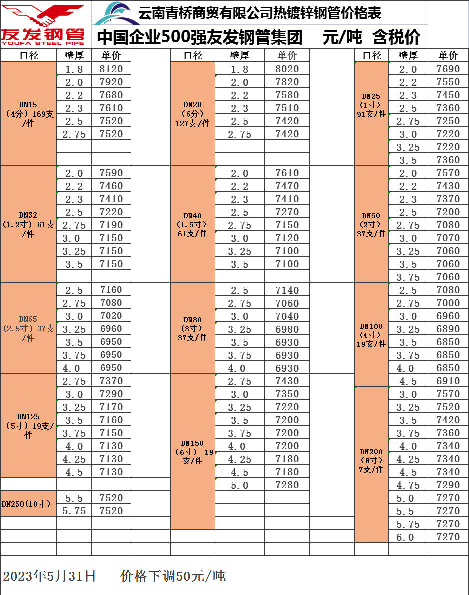 5月31日镀锌管价格下调50元每吨,具体价格请来电咨询。